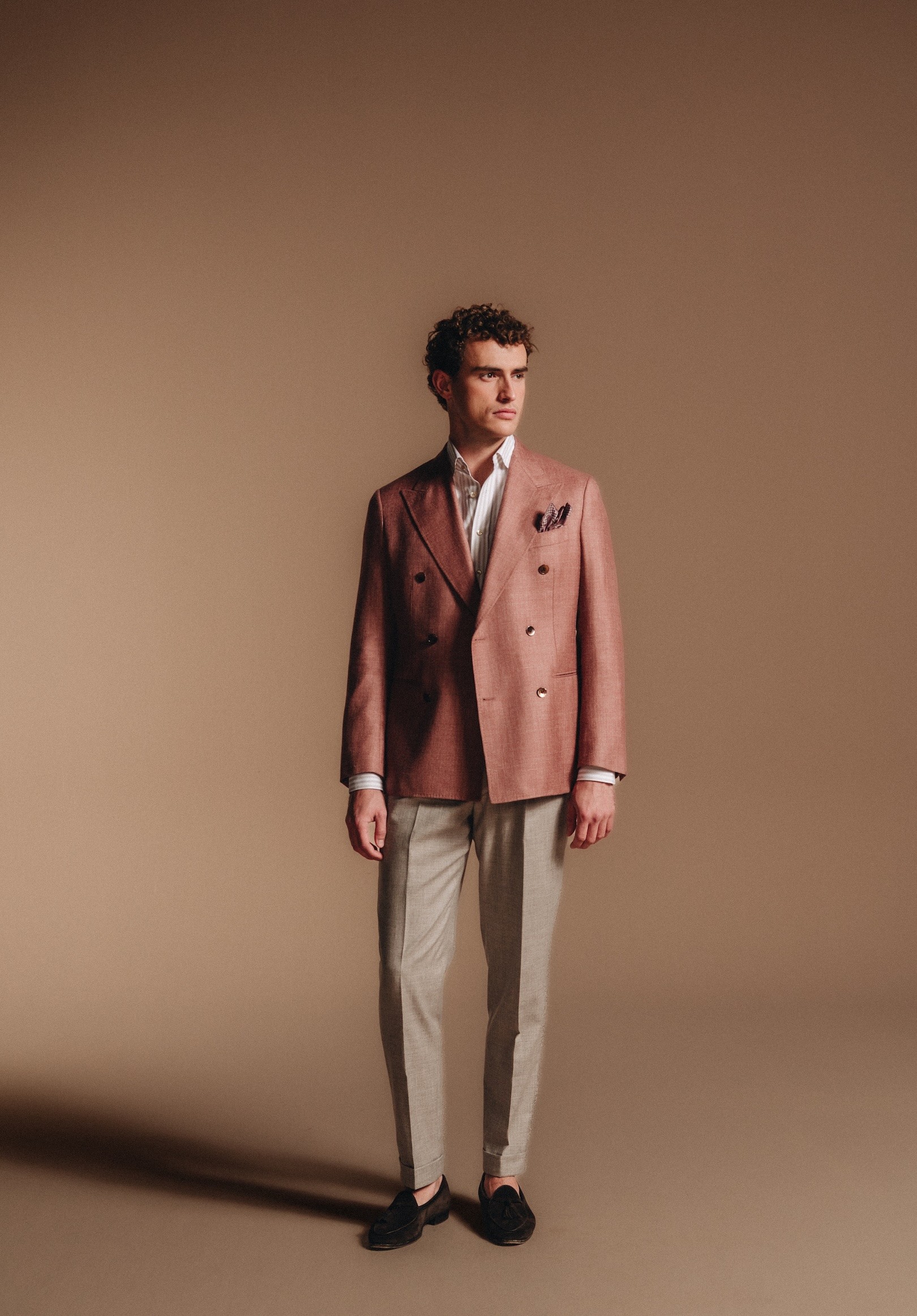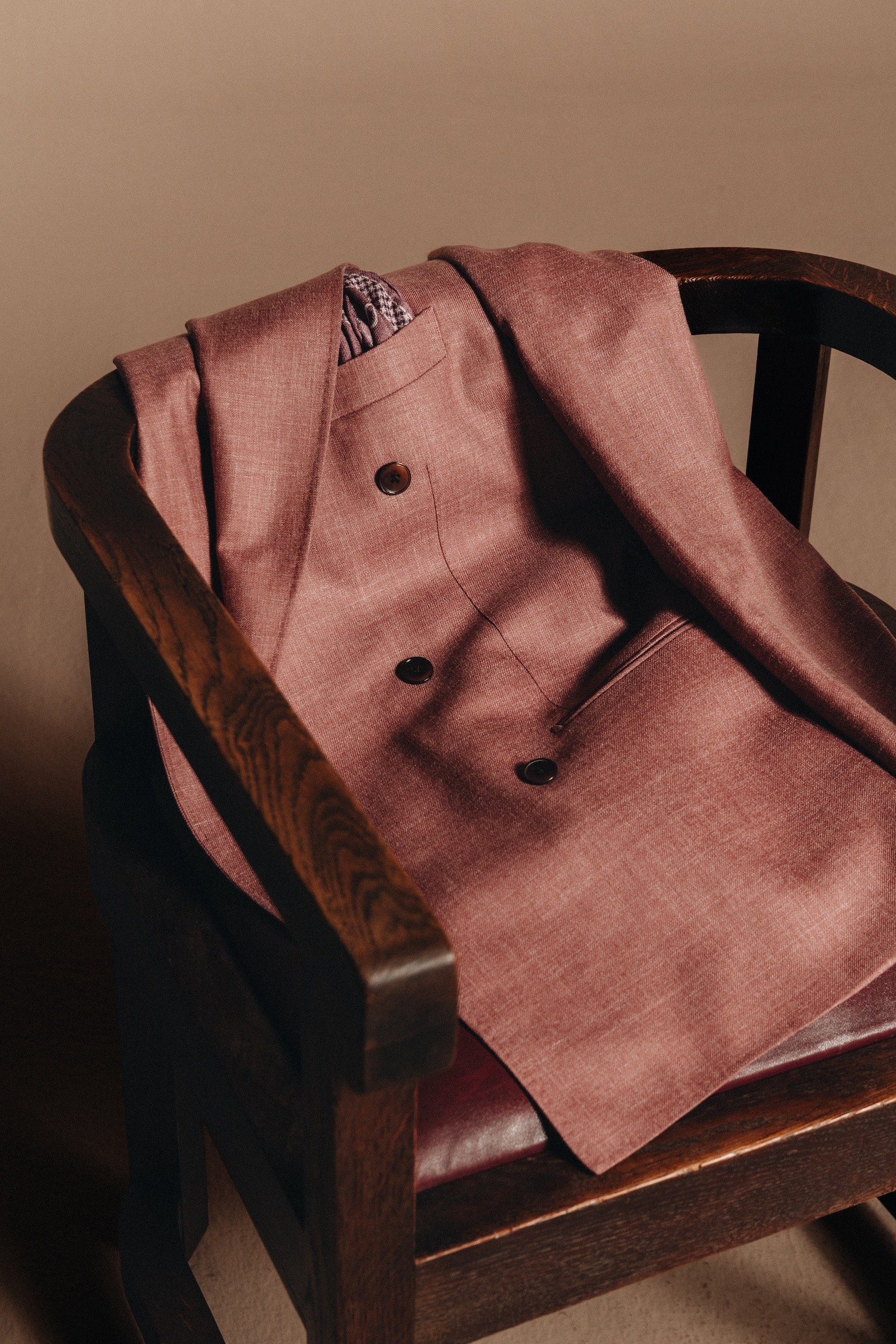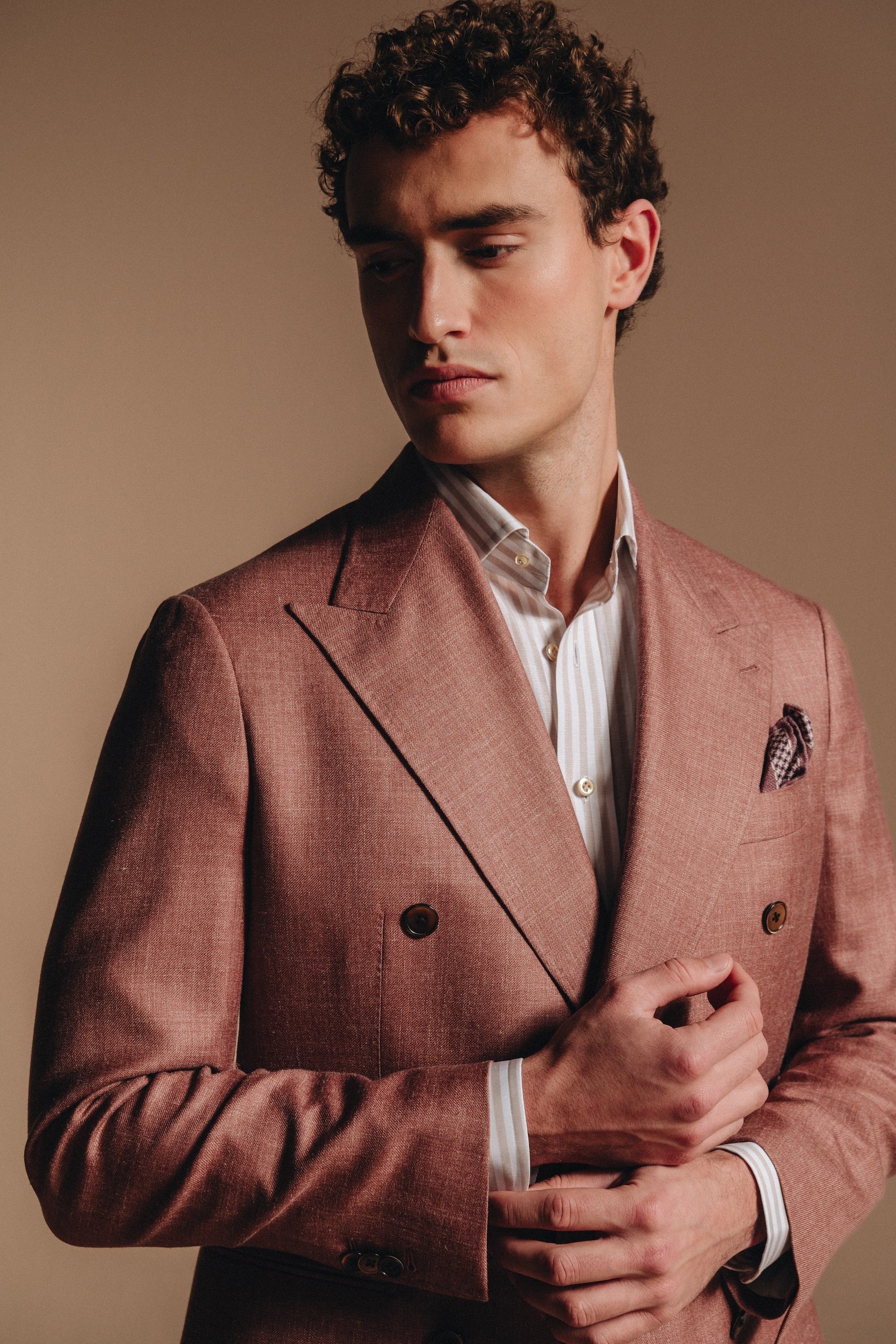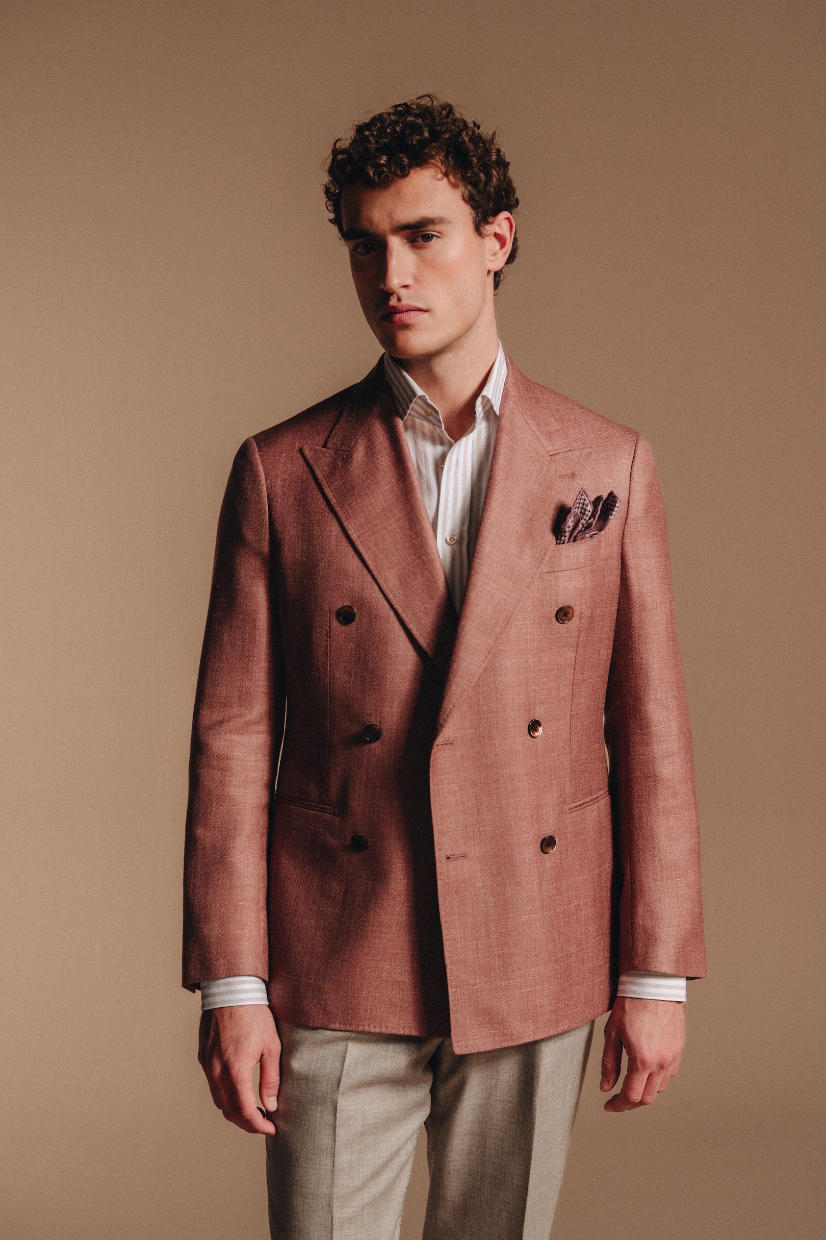 Dit dusty pink double breasted pak ademt Italiaanse zomerse elegantie. De luchtige blend van katoen en linnen combineert comfort met karakter, perfect voor lange zomerdagen, garden parties of als bruiloftsgast.