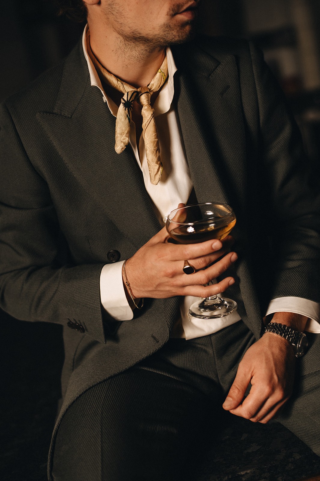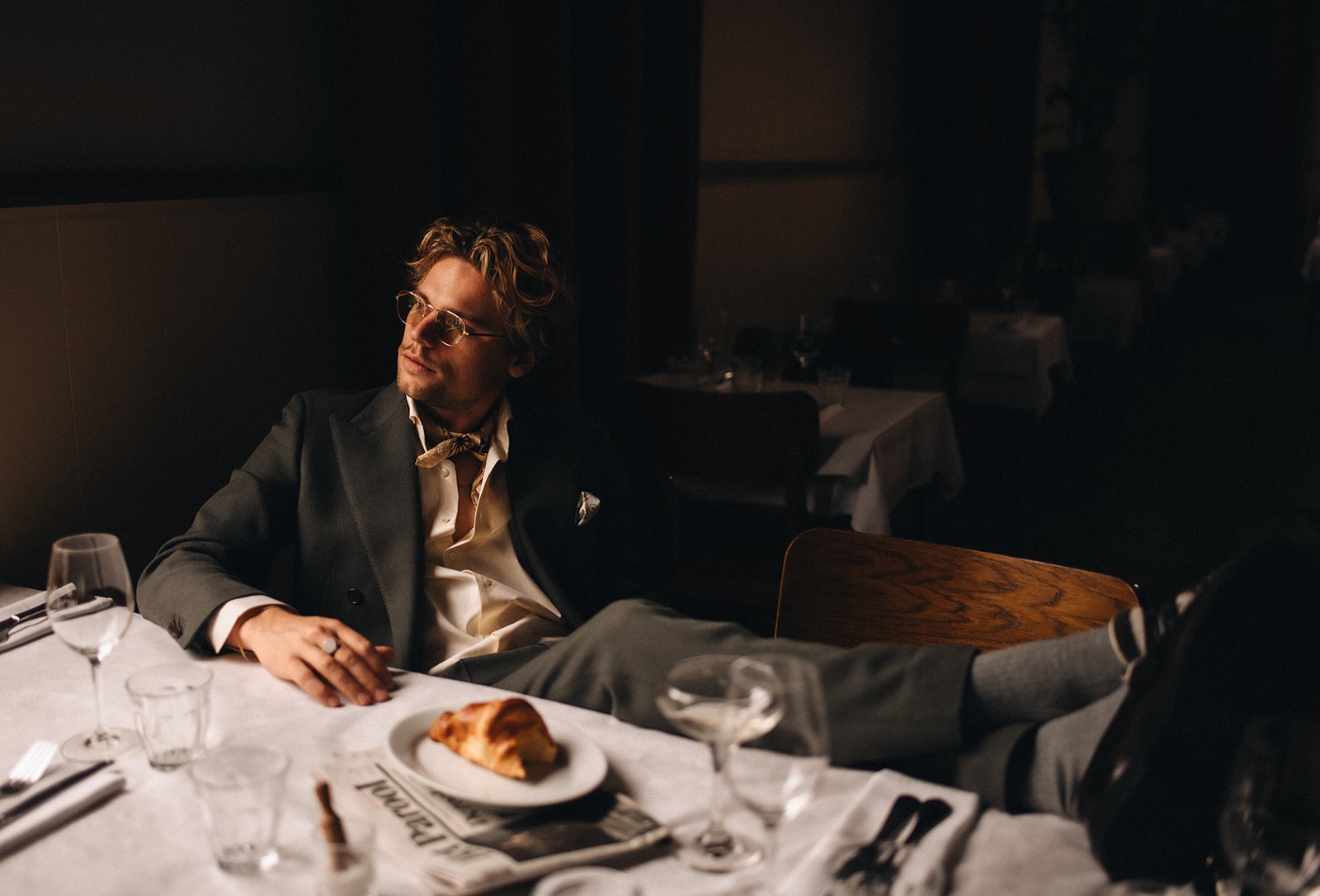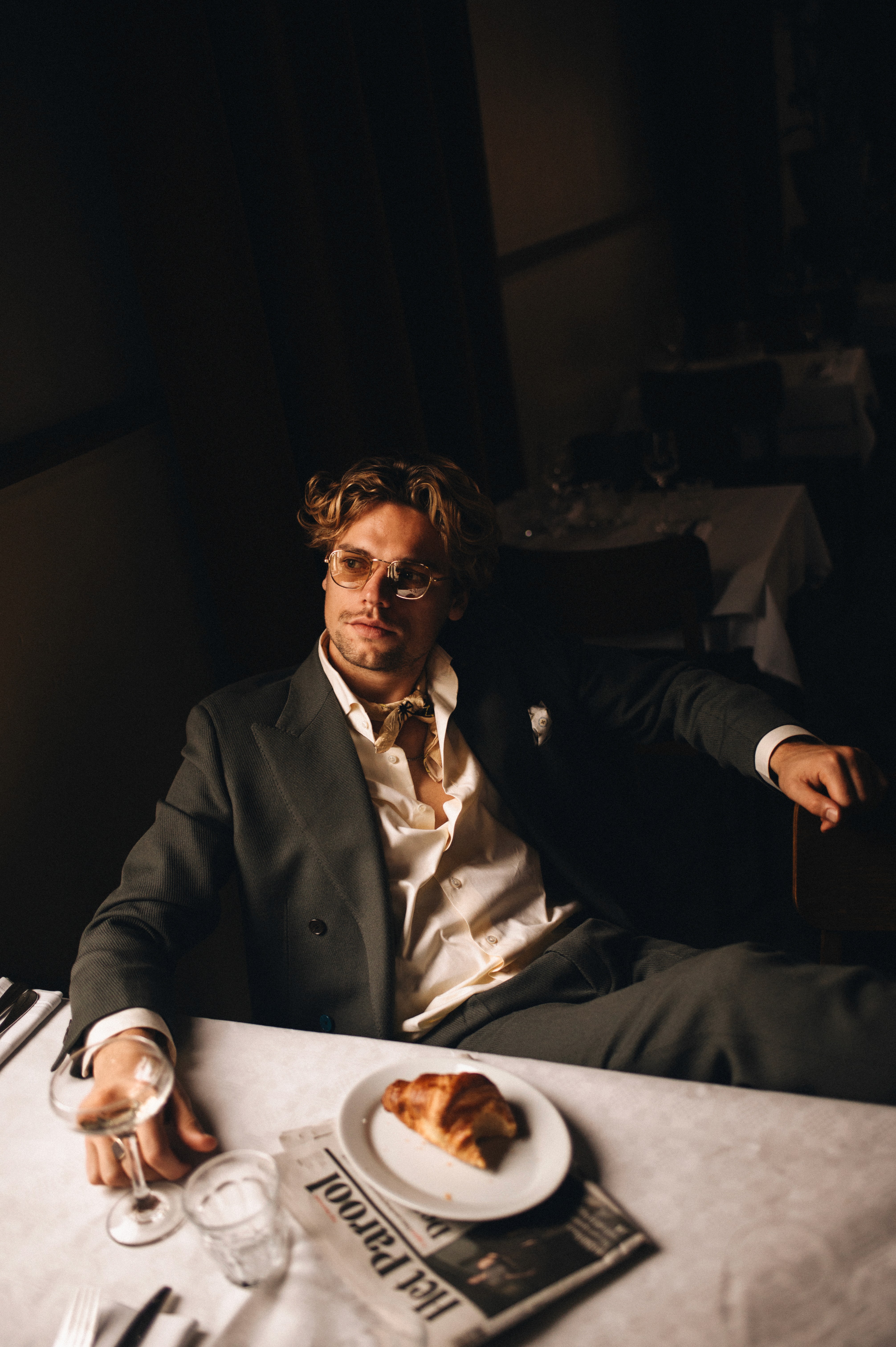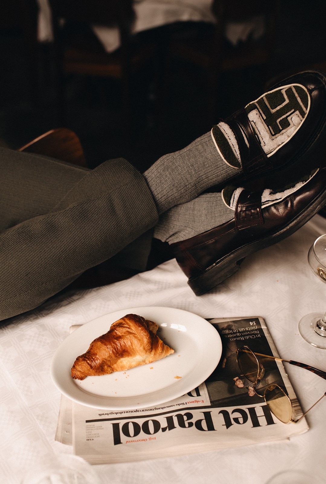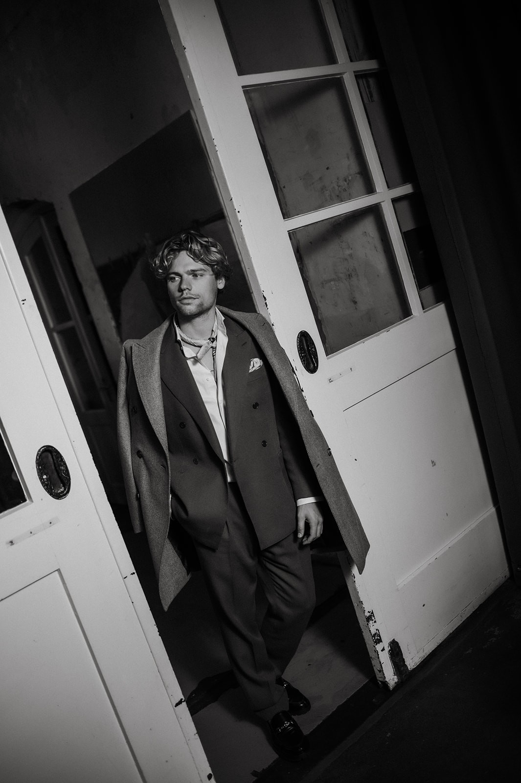 “In mijn vrije tijd draag ik vaak een basic outfit opgetuigd met eyecatchers als een soort kerstboom. Mijn signature items zijn mijn bandana, vintage Rolex, een ketting, een zegelring die ik van mijn opa heb gekregen en loafers. Ik houd ervan om die losse items voor een extra touch te gebruiken. Ik kleed me eigenlijk voor alles wel een beetje hetzelfde. Of ik nu in een bos een gat sta te graven om een kampvuur te maken of op een première sta. Die bandana is wel echt mijn ding geworden het laatste jaar. Ik draag er bijna iedere dag wel één om mijn nek. Je ziet dit nu vaker, maar ik zie het nog niet vaak genoeg om me daar echt aan te storen. Niemand heeft mijn bandana’s, dat scheelt ook. Je ziet ze allemaal met zo’n zelfde boerenzakdoek, nou succes met je boerenzakdoek.”
